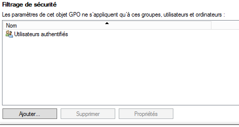Dans certains cas, nous sommes amenés à modifier ce filtrage de sécurité, car nous ne voulons pas cibler tous les utilisateurs ou tous les ordinateurs, mais uniquement certains objets. Dans ce cas, nous allons retirer "Utilisateurs authentifiés" afin de positionner à la place un groupe de sécurité (dont vous gérez les membres).