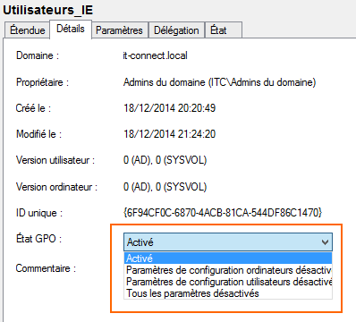 En sélectionnant une GPO et en cliquant sur l’objet « Détails », il est possible de donner différents états à la GPO (notamment des états de désactivation). Vérifiez que l’état est bien sur « Activé » pour activer l’ensemble des paramètres (ordinateurs et utilisateurs) définis dans cette GPO. Sinon, vous rendez inactif tout ou partie des paramètres de la GPO.