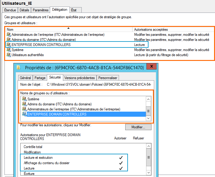 On remarque que les informations que l’on retrouve dans cet onglet sont équivalentes à celles que l’on retrouve dans l’onglet « Sécurité », en accédant aux « Propriétés » d’un dossier d’un élément GPO (dans SYSVOL). Voyez par vous-mêmes :