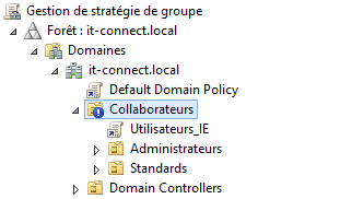 De plus, si deux GPOs sont forcées, ce sera celle de plus haut niveau qui sera prioritaire ! Par exemple, si je force la GPO « Default Domain Policy » et la GPO « Utilisateurs_IE », ce sera la première qui gagnera sur la deuxième, car elle est placée « plus haut ».