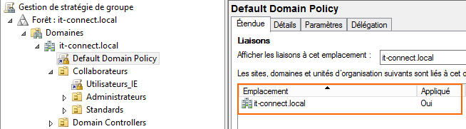 À savoir également : si l’héritage sur l’OU « Collaborateurs » est désactivé comme ci-dessus, mais que la GPO « Default Domain Policy » est « Appliqué » (Enforced), elle sera appliquée malgré tout. Autrement dit, elle outrepasse le blocage et s’applique quand même.