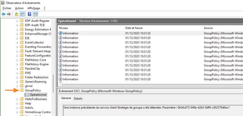 - Journaux des applications et des services > Microsoft > Windows > GroupPolicy > Opérationnel