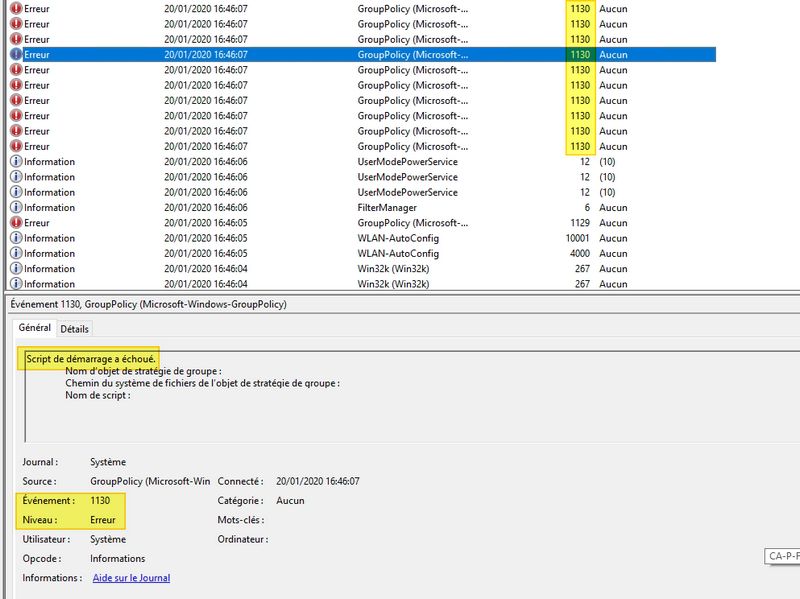 Par exemple, vous pouvez identifier des logs avec les codes d'erreur 1129 et 1130 dans l'observateur d'événements de la machine.