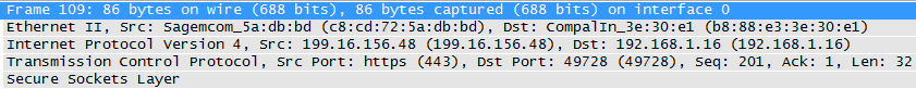 Nous allons maintenant étudier un paquet pris lors d'un sniff réseau et essayer d'y trouver nos différentes couches, prenons par un exemple un paquet HTTPS (Affichage Wireshark) :