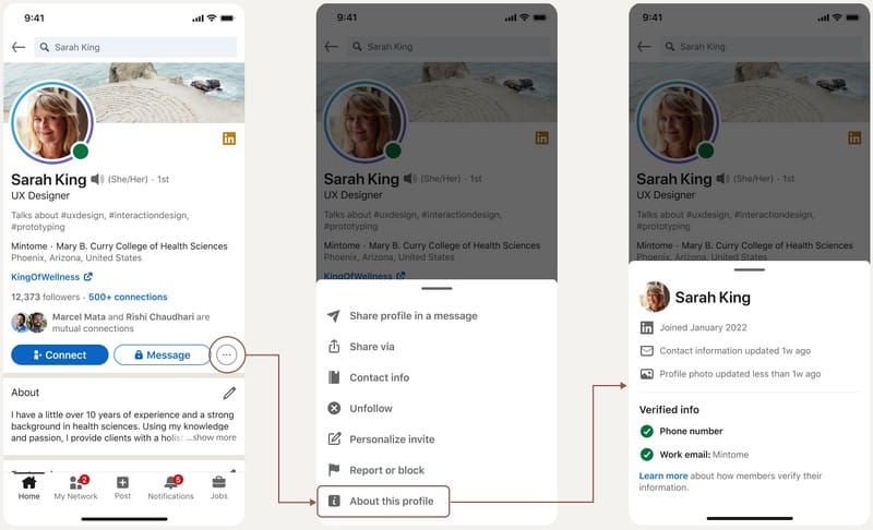 Comme le montrent les images ci-dessous, LinkedIn commence à déployer une nouvelle option nommée "À propos de ce profil" afin de pouvoir vérifier diverses informations : date de création du profil, date de modification de la photo de profil, numéro de téléphone vérifié ou non, e-mail vérifié ou non, etc. Grâce à cette section, il est possible de mieux analyser un profil avant d'accepter une demande de connexion, par exemple.