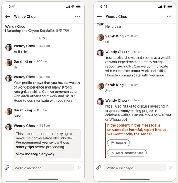 Désormais, si une personne vous invite à poursuivre la conversation en dehors de LinkedIn, par exemple sur WeChat ou WhatsApp, le réseau social affichera un message d'avertissement dans la conversation. Voici un exemple :