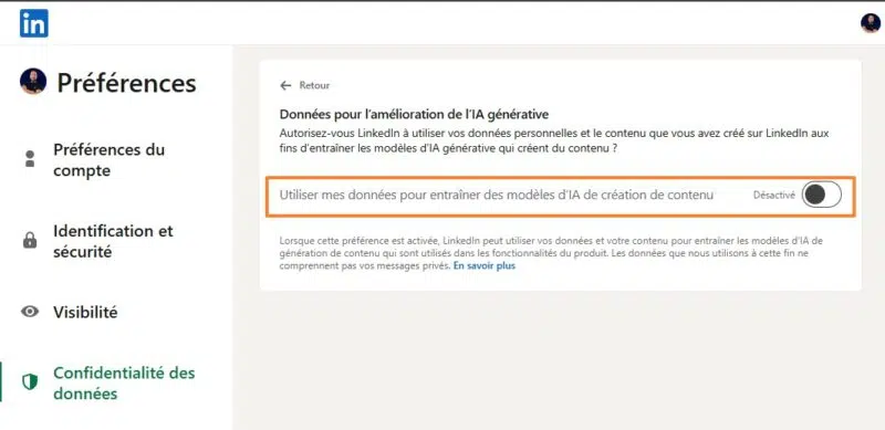 Si vous souhaitez vous y opposer, vous devez agir puisque LinkedIn a choisi une approche d'opt-out, ce qui signifie que l'option associée à ce changement est activée par défaut. Chaque utilisateur doit donc se rendre dans les paramètres de son compte avant la date butoir du 3 novembre.