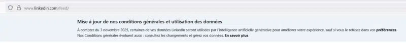 Depuis quelques jours, LinkedIn affiche un bandeau discret dans le haut de l'interface pour vous informer de ce changement à venir : "À compter du 3 novembre 2025, certaines de vos données LinkedIn seront utilisées par l’intelligence artificielle générative pour améliorer votre expérience, sauf si vous le refusez dans vos préférences."