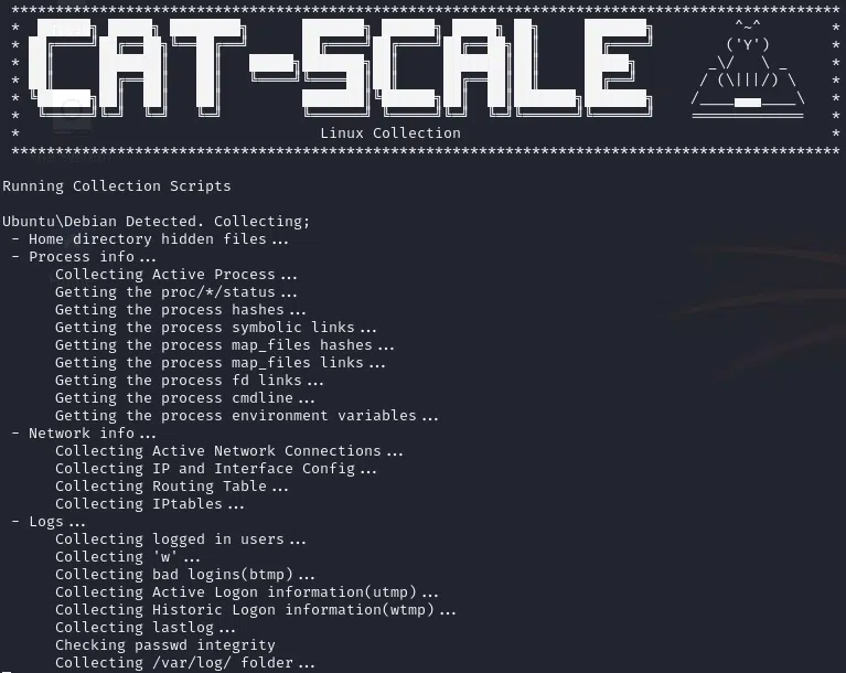 Linux CatScale est avant tout un script bash, celui-ci vise à collecter au sein d’une archive tous les éléments qui pourront intéresser un analyste dans le cadre d’une investigation numérique, aussi connu sous l’acronyme DFIR (Digital Forensic Incident Response). Ces éléments sont par exemple :