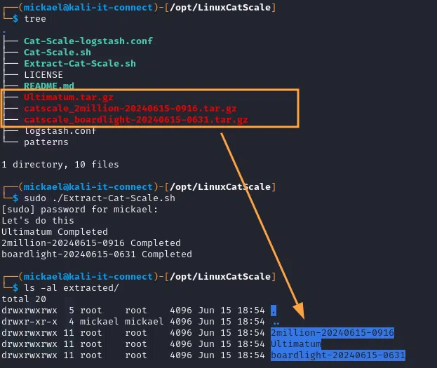 Dans le cas où vous menez une analyse sur plusieurs systèmes en simultanés, le script d’extraction peut gérer cela de la même façon qu’avec une seule archive. Il suffit de toutes les positionner dans le répertoire de Linux CatScale et d’exécuter le script d’extraction :