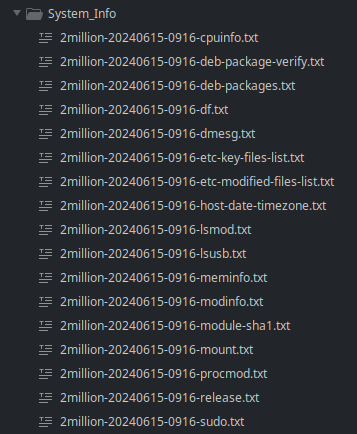 Sont ici stockés des fichiers supplémentaires contenant le résultat de diverses commandes qui sont le fruit des retours d’expérience des éditeurs. Le fichier "pot-webshell-first-1000.txt" contiendra par exemple les 1000 premières lignes de tous les fichiers web du serveur (".php", ".jsp", ".asp", etc.). Cela peut être utile pour une analyse rapide avec des règles Yara (recherche de signature de malware). Un autre exemple est le fichier "exec-perm-files.txt" qui contient la liste de tous les fichiers ayant la permission d’exécution sur le système.