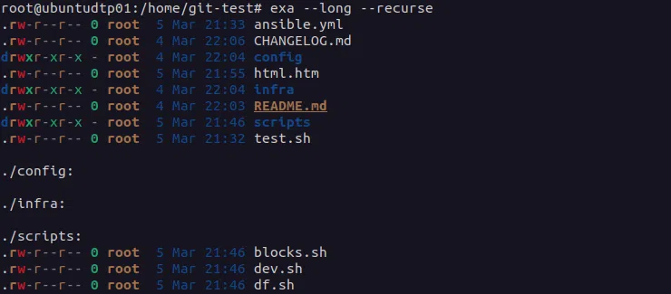 L'exemple précédent montre également que la commande "exa" s'intègre à Git. Ici, on voit qu'elle souligne et met le README.md en surbrillance pour le repérer plus facilement.