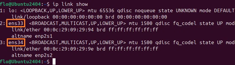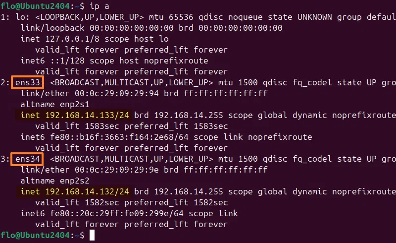 Cela affichera la liste de toutes les interfaces réseau. Dans mon cas, cela me permet d'identifier le nom de mes 2 interfaces réseau : ens33 et ens34.