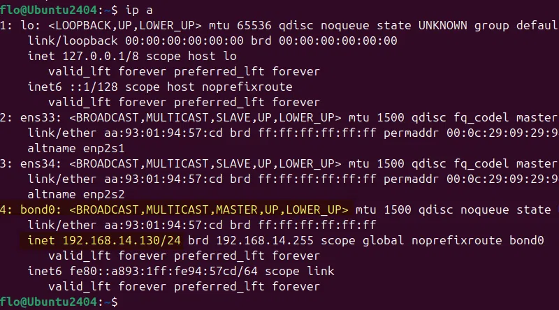Ensuite, nous pouvons maintenant vérifier que le bonding est actif avec cette commande :