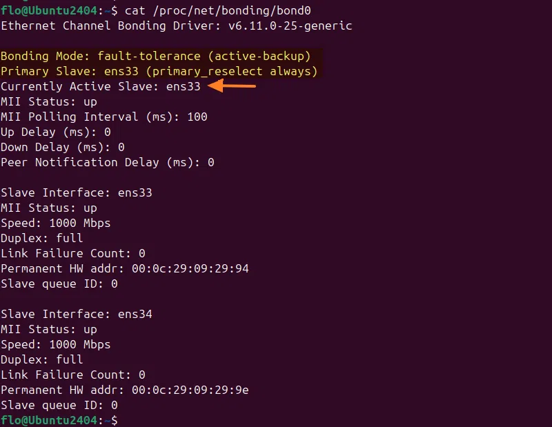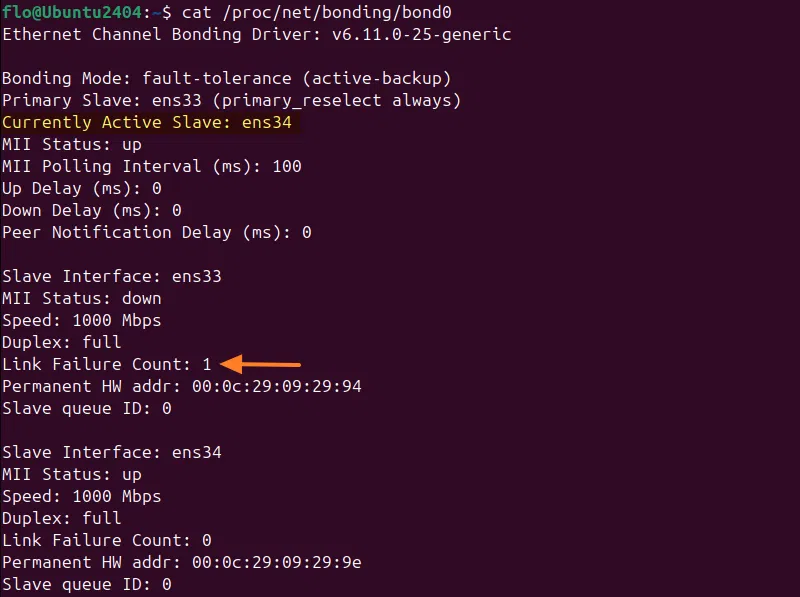 Désormais, l'interface active est ens34 et nous pouvons voir que le compteur de liaison défaillante (Link Failure Count) est passé à 1 pour l'interface ens33. Lorsque l'interface ens33 sera de nouveau opérationnelle, elle reprendra sa place d'interface active.