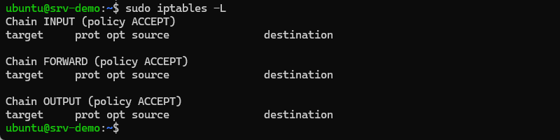 Nous pouvons à nouveau vérifier que le pare-feu est désactivé avec la première commande exécutée dans le cadre de ce tutoriel. Désormais, la liste doit être vide.