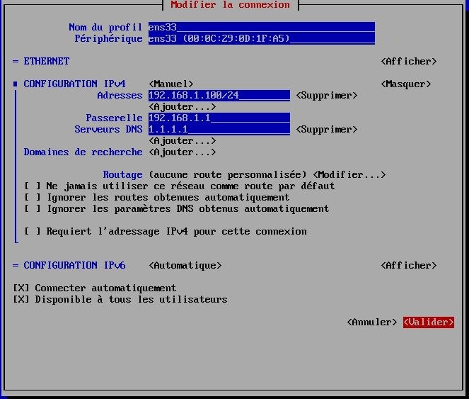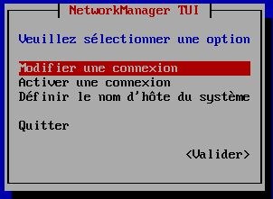 La gestion des adresses IP sur Linux varie en fonction de la distribution. Par chance sur CentOS, il existe un utilitaire qui permet de faire cela en un rien de temps : NetworkManager TUI