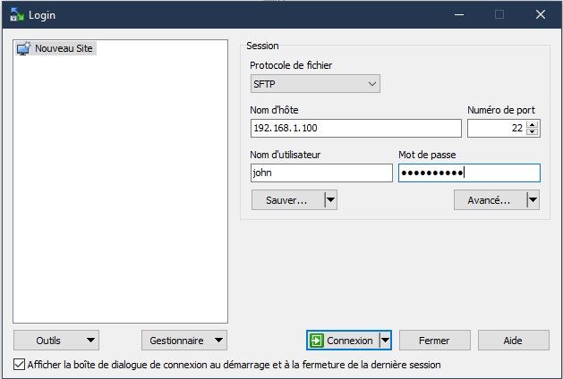 Pour le test, j’utilise WinSCP que j’aime beaucoup, mais vous pouvez utiliser Filezilla sans problème. Pour rappel, Windows 10 permet l’utilisation de sftp nativement, mais en ligne de commande, WinSCP ou FileZilla ont l’avantage de représenter l’arborescence à la manière d’un Explorer ce qui facilite grandement la manipulation de fichiers et répertoires.