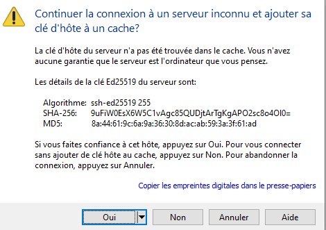 Il est fort probable qu’a la première connexion, vous ayez un message de ce type. Normal, le serveur est inconnu, donc le logiciel ne peut comparer sa clé à une autre en mémoire. Cliquer sur « Oui » pour continuer le processus de connexion.