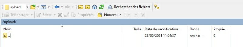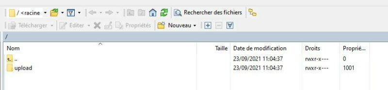Rappelez-vous, lors de la configuration du service, on a spécifié « ForceCommand internal-sftp -d /upload » donc le répertoire qui sera utilisé par l’utilisateur doit s’appeler « upload ».