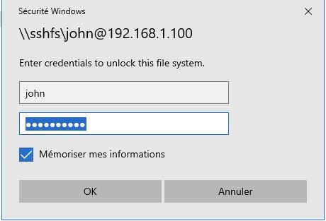 Note : je ne préconise pas de montage permanent ni sous Linux ni sous Windows. La création d’un tel serveur de fichier est à des fins de sécurité, or un montage permanent va à l’encontre de ce principe, surtout si l’utilisateur n’as pas de mot de passe de session par exemple.