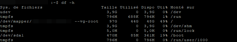 Lorsqu'il n'y a plus d'espace disque sur un système Linux, le premier réflexe c'est d'utiliser la commande "df" pour voir l'état des différents volumes.