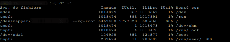 Sous Linux, chaque fichier est associé à un inode qui sert de descripteur pour ce fichier (métadonnées). Le nombre d'inodes, ou nœuds d'index en français, car inode c'est la contraction de "index" et "node", est limité sur un volume. Pour connaître la limite d'inodes, il faut analyser la configuration du serveur, car cela dépend de la taille du volume. La commande "df" est toujours notre alliée, sauf que l'on va utiliser l'option "-i" qui permet d'obtenir des informations sur les inodes plutôt que les blocs.
