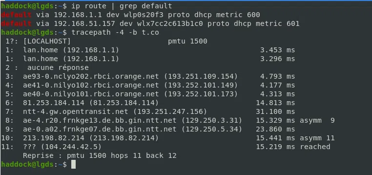 - Utiliser tracepath, pour vérifier que la première passerelle a changé par rapport à la première exécution de la commande
