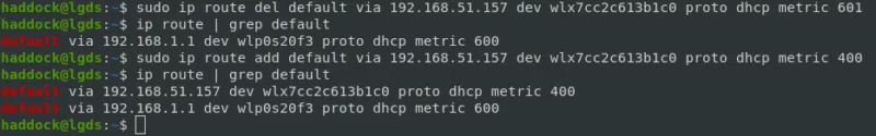sudo ip route add default via 192.168.51.157 dev wlx7cc2c613b1c0 proto dhcp metric 400