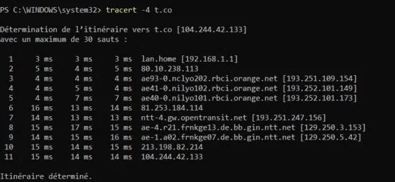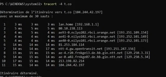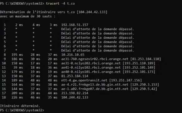Vous constaterez que j'ai eu une microcoupure internet lors du tracert, d'où les 6 messages "Délai d'attente dépassé"