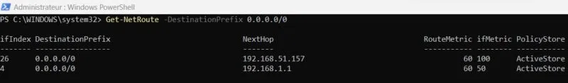 Comme pour Linux, la nécessité d'être administrateur local pour modifier la table de routage sous Windows découle de considérations de sécurité. Les actions ci-après seront toutes exécutées dans un terminal PowerShell privilégié pour une question de pratique, même si certaines commandes comme Get-NetRoute ne nécessitent pas de tels privilèges.