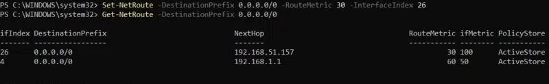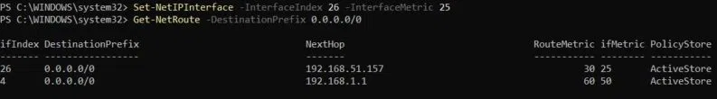 Set-NetRoute -DestinationPrefix 0.0.0.0/0 -RouteMetric 30 -InterfaceIndex 26
