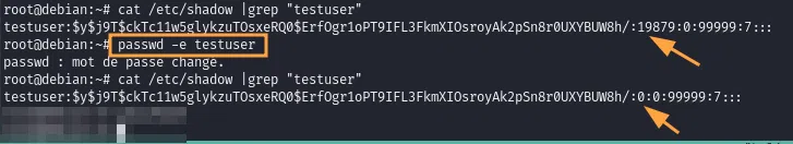Comme vous pouvez le voir, cette action a pour effet de paramétrer le 3ème attribut de l'utilisateur ciblé à "0" dans le fichier "/etc/shadow" :