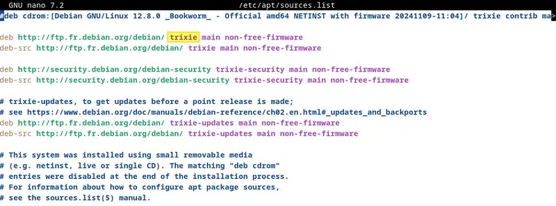 Puis, nous allons modifier les noms des dépôts pour remplacer les occurrences bookworm en trixie. Inutile de le faire manuellement, la redoutable commande sed va nous aider à effectuer cette action de façon automatisée. Voici la commande à exécuter :