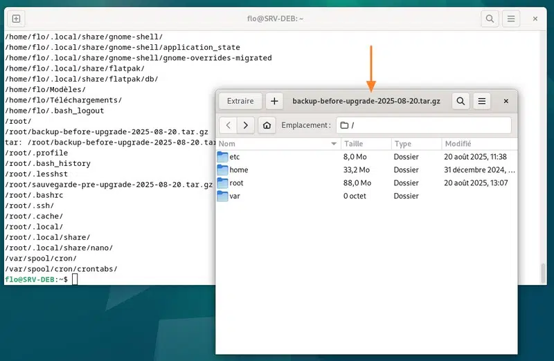 Comment réaliser cette sauvegarde ? L'exemple ci-dessous sert à créer une archive compressée au format tar.gz contenant les répertoires essentiels du système, comme les configurations, les données utilisateurs, les tâches planifiées, et la liste des paquets, afin de disposer d’une sauvegarde avant une mise à niveau.