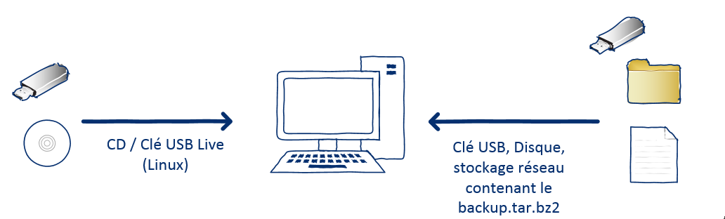 - Du fichier "backup.tar.bz2" produit précédemment, disponible sur un espace de stockage (USB, réseau, ...) et prêt à être utilisé.