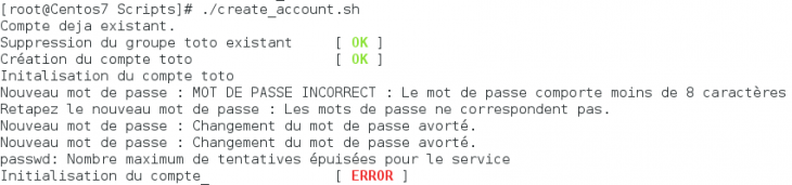 En cas d’erreur, lors d’une des étapes on affichera alors soit le message [ OK ], soit le message [ ERROR ]. A l’aide des éléments que l’on vu précédemment, on va donc générer notre script. Il s’agit là d’un exemple simpliste, mais on voit très bien comment mettre cela en fonction pour des scripts plus complexes :