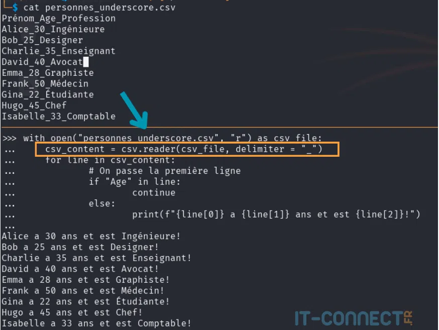 Bref, vous avez compris le principe, le fait de lire ligne par ligne le contenu de notre fichier CSV permet de réaliser des opérations précises par ligne et aussi sur les colonnes souhaitées grâce à l’utilisation des listes.
