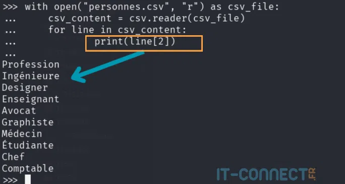 Nous avons en retour l’affichage de plusieurs listes (encadrées par des crochets "[ ]"). Plus précisément, une liste par ligne du fichier CSV. Cela est plutôt pratique puisque l’on peut localiser facilement une "case" de notre CSV. Par exemple, isolons uniquement les professions en adaptant un peu notre code :