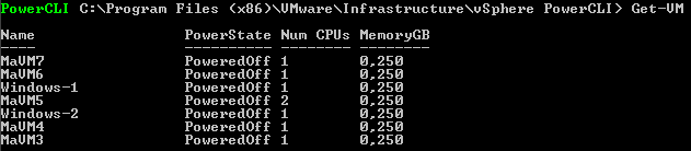 Le listing de machines virtuelles avec la console PowerCLI passe par l’utilisateur du command-let « Get-VM » auquel on peut ajouter des options afin d’afficher uniquement certaines VM, selon la banque de données où elles sont stockées, l’hôte sur lequel elle se trouve, etc… Nous allons voir dans ce tutoriel l’utilisation de ce command-let.