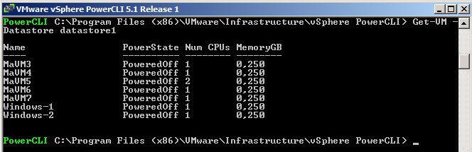 Maintenant, nous allons voir comment lister les VMs stockées sur une banque de données précise, sans lister celles qui se trouvent sur d’autres banques de données. Pour cela, on utilise toujours le même command-let avec l’option « -Datastore ». Par exemple, pour lister les VMs stockées sur le datastore nommé « datastore1 » cela donnera ceci :