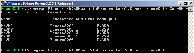L’option « -Location » permet de lister les VMs d’un cluster, d’un centre de données, d’un pool de ressources, etc… Par exemple, pour lister les VMs situées dans le pool de ressources « Service Informatique », voici ce que ça donne :