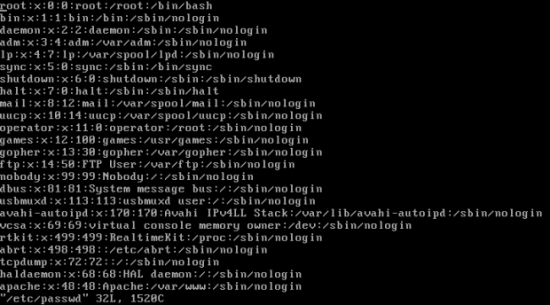 Par exemple, l’interrogation du fichier /etc/passwd fournit la liste des enregistrements de ce fichier (et donc, des comptes existants sur le système), sous la forme suivante :