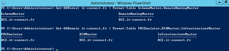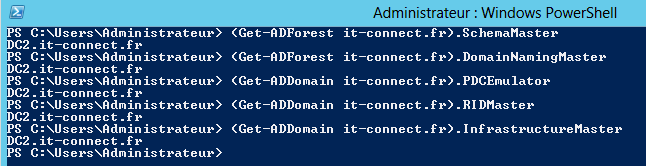 (Get-ADForest it-connect.fr).SchemaMaster (Get-ADForest it-connect.fr).DomainNamingMaster (Get-ADDomain it-connect.fr).PDCEmulator (Get-ADDomain it-connect.fr).RIDMaster (Get-ADDomain it-connect.fr).InfrastructureMaster