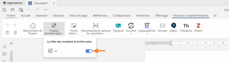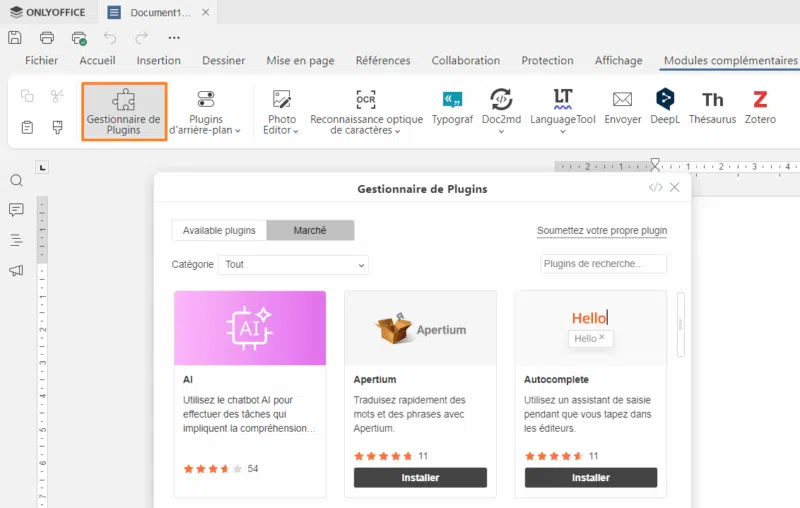 Dès à présent, vous devez ouvrir l'interface de ONLYOFFICE pour activer et configurer le module IA. Dans l'éditeur, cliquez sur l'onglet "Modules complémentaires" puis sur le "Gestionnaire de plugins". Ici, vous devez installer le module "AI", qui est d'ailleurs peut-être déjà actif.