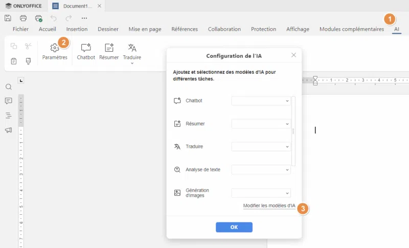 Désormais, vous devez configurer le module AI d'ONLYOFFICE pour qu'il interroge LM Studio via l'API. Cliquez sur l'onglet "AI" puis sur "Paramètres". Cliquez ensuite sur "Modifier les modèles d'IA". Il est important de comprendre que ONLYOFFICE peut solliciter des modèles différents (locaux ou distants), en fonction du type de tâches à accomplir.