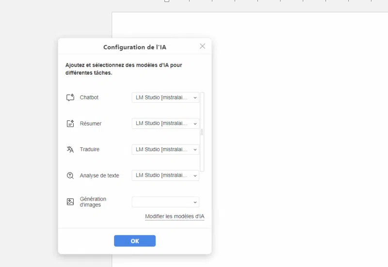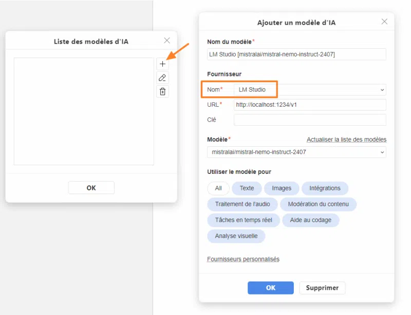 Dans cet exemple, le modèle est associé à différentes tâches liées au traitement du texte et à la partie chatbot. Vous pouvez ajouter plusieurs fois votre instance LM Studio pour pointer vers des modèles différents. Par exemple, le modèle mistral-ocr-2505 de chez Mistral AI est adapté pour l'OCR.