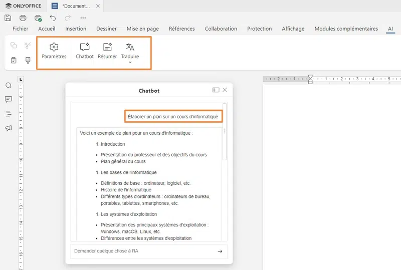 Voici quelques exemples d’utilisation concrète de l'IA avec ONLYOFFICE :