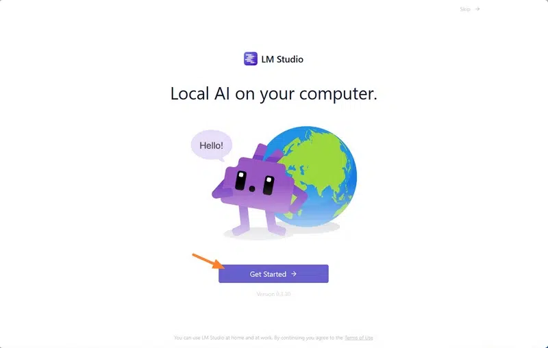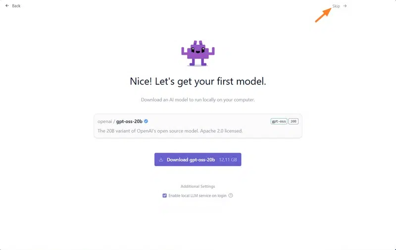 Ensuite, LM Studio propose de télécharger un modèle gratuit de chez OpenAI. Ici, nous allons plutôt regarder du côté des modèles open source de chez Mistral AI, une entreprise française. Cliquez donc sur "Skip" en haut à droite pour éviter de télécharger ce modèle inutilement (soit 12 Go).