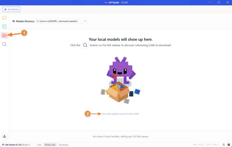 LM Studio est désormais installé sur notre machine Windows, mais il n'y a pas de modèle téléchargé en local. Il est donc difficile d'en faire quoi que ce soit. Pour remédier à cela, cliquez sur l'icône "Mes modèles" situé sur la gauche, puis sur le lien "Go and explore some local LLMs!".